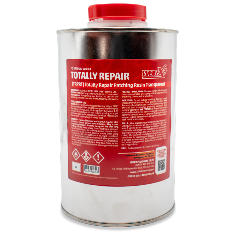 Part of the Formula Worx range of floor treatment products, the Totally Repair Patching Compound, Resin Transparent (TRPRT) is a high performance, rapid curing, two component, transparent concrete and masonry patching compound.