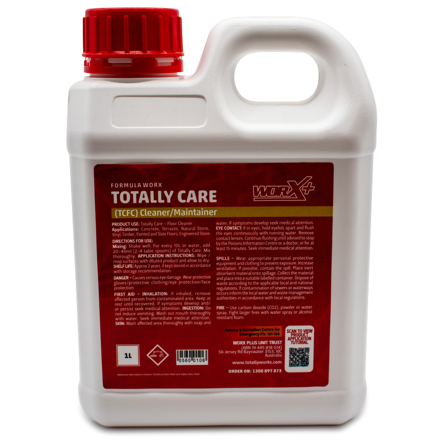WORX+ Totally Care Floor Cleaner (TCFC) is a unique cleaning agent made from natural compounds to provide cleaning properties distinct from common detergents. Free from bases & phosphates it contains no gloss agents, waxes or polymers.
