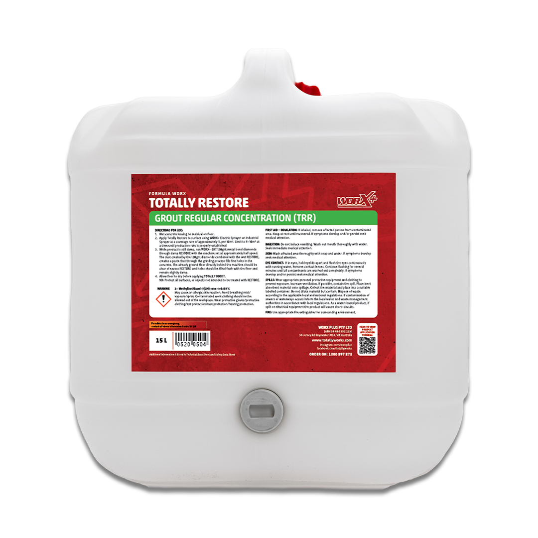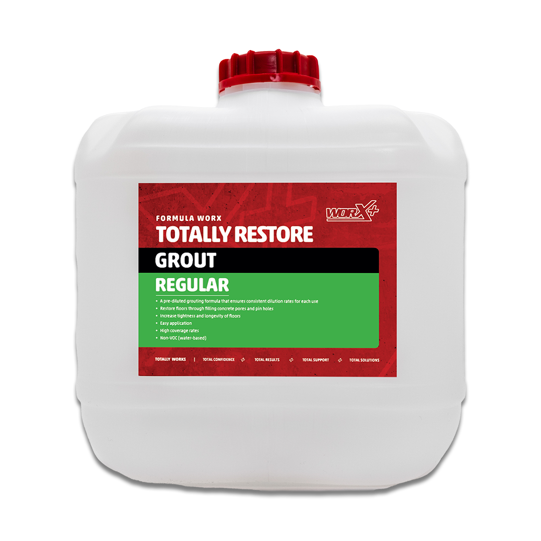 Totally Restore is a grouting formula, specifically designed to restore floors through filling concrete pores and pin holes. The combination of the grout and grinding process fills and patches small air pockets in concrete, creating a closed and tighter slab.